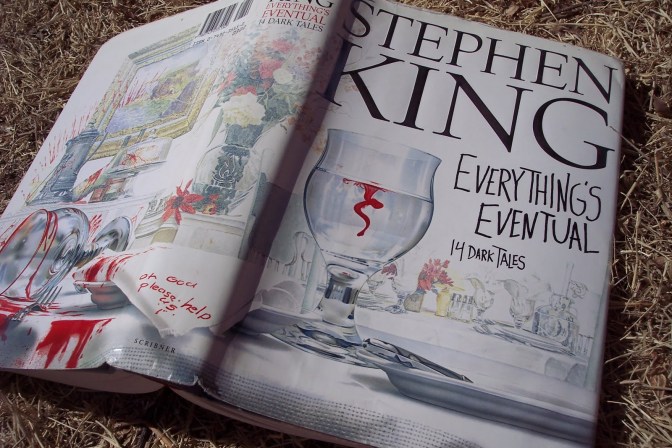 When you turn “Everything’s Eventual” over to read the back cover, you see it. A note, scribbled in the same red as that drop in the glass, short, simple and full of desperation: “Oh God please help us.” By the time you see the back of the book, the splatters of red on the wall, the drenched and disarrayed tablecloth, the tortured hand prints – you’re locked tight into the grip of dumb horror.